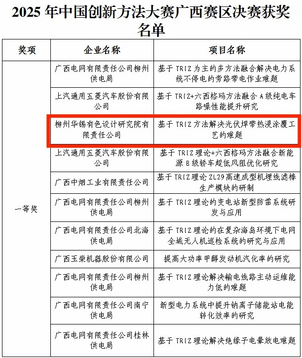 近日,2025年中国创新方法大赛广西赛区决赛在南宁圆满落幕。经过激烈角逐,华锡有色设计研究院发表的《基于TRIZ方法解决光伏焊带热浸涂覆工艺的难题》项目荣获广西赛区一等奖。